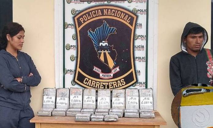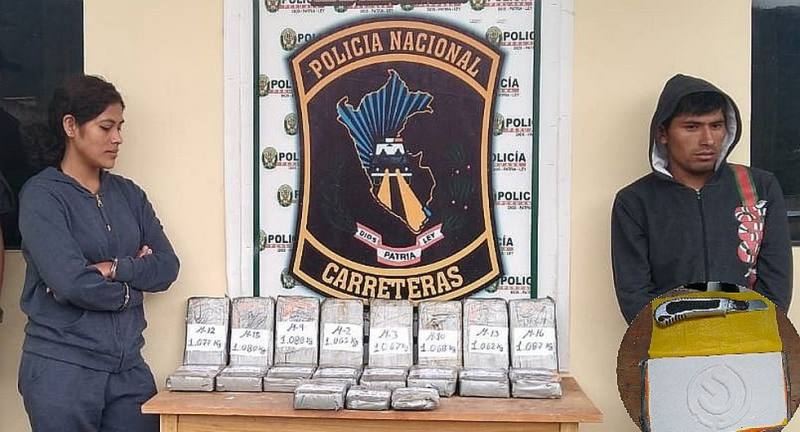 La Policía de Carreteras de Andahuaylas incautó 19 kilos de clorhidrato de cocaína a una pareja procedente de Ayacucho y que tenía como destino final la ciudad fronteriza de Tacna, informaron voceros de la institución.