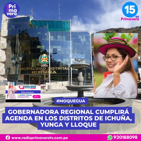 La gobernadora regional llevará a cabo una intensa jornada de actividades este [día del evento], visitando los distritos de Ichuña, Yunga y Lloque. Su agenda incluye reuniones con autoridades locales, entrega de implementos y obras orientadas a mejorar las condiciones educativas y sociales en estas zonas.Actividades en Ichuña:La jornada comenzará en Ichuña a las 08:00 hrs, donde la gobernadora se reunirá con el alcalde del distrito. Posteriormente, a las 08:30 hrs, entregará laptops al Instituto Alianza Ichuña Bélgica y, a las 09:00 hrs, hará entrega de casacas a docentes y estudiantes, además de mobiliario escolar a la Institución Educativa Ramón Castilla. La mañana culminará con el inicio del IOARR Criadero de Truchas en el sector de Totorani, programado para las 10:00 hrs. Visita a Yunga:En el distrito de Yunga, a las 11:00 hrs, la gobernadora entregará implementos al comedor popular del distrito, seguido de la entrega de hamburguesas de pescado a los pobladores, en un esfuerzo por mejorar la alimentación de la población vulnerable. Jornada en Lloque:La gobernadora concluirá su recorrido en el distrito de Lloque, donde participará en la acción cívica "Gore en tu Barrio" a las 10:00 hrs. Además, entregará implementos a los comedores populares de Lucco y Lloque a las 12:30 hrs. La tarde continuará con el inicio de la obra "Shock de Inversiones" a las 14:00 hrs y finalizará con una visita a la represa Chirimayuni a las 16:00 hrs.Este recorrido busca fortalecer los vínculos entre la población y el gobierno regional, mediante la entrega de recursos, ejecución de obras y actividades orientadas a mejorar la calidad de vida en estas comunidades.