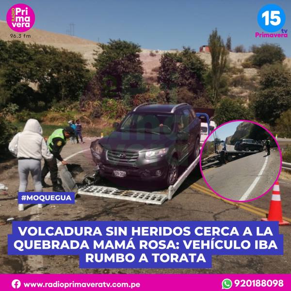 Jueves 25 de septiembre, por la mañana. Se reportó la volcadura de un vehículo de placa V2N-208 en la zona cercana a la quebrada Mamá Rosa, en la ruta con destino a Torata.
